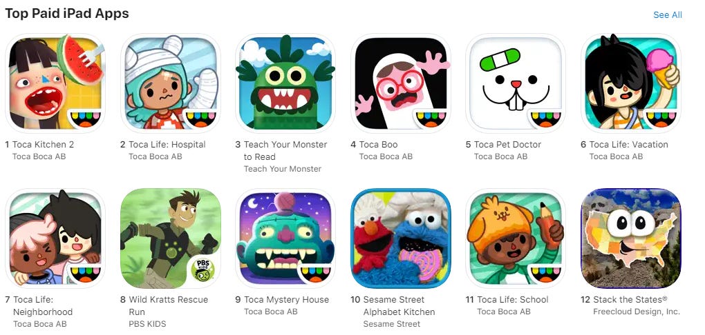 Toca Boca, a Swedish game developer, dominates the mobile kids' games category. As of March 2023, eight out of the top 12 paid iPad apps for kids on the Apple App Store were created by Toca. Toca games are popular because they enable kids to use their imagination to create stories for the characters in the games. Children enjoy unrestricted creativity, with no rules or goals, reminiscent of Montessori-style play. Kids want to roleplay what they see their parents or others doing, but in their own way.